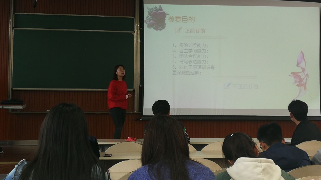 他山之石,可以攻玉,接下来三位参加过全国大学生化工实验大赛的2015级学长学姐给同学们作了一个比赛的经验分享。他们简单地介绍了这个比赛的主要内容。该赛事主要有化工原理理论机考、化工单元仿真操作以及化工原理实验三个部分,几乎涵盖了化工原理中所有的单元操作,是对化工原理知识点的综合考察。可以说,参加这个比赛不仅能锻炼自己各方面的能力,还可以让同学们对化工原理的知识有更为深刻的认识和理解。他们还就组队等相关事项给出了一些建议。