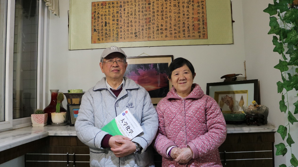 到曾政权老师家中时,两位老人恰在茶余饭后休息,电视是关着的,书桌上的灯还亮着。看见化院学子的到来,曾老师和妻子刘咏秋老师脸上堆满了笑容,准备了不少零食热情招待,散发的精气神,完全看不出将入耄耋之年。