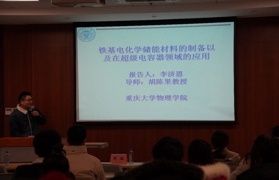 博士研究生李济恩介绍他关于电化学储能材料方面的研究课题,以传统电容器到超级电容器以及理论模型引出自己的研究体系,详细讲述了他的研究过程。逻辑缜密,有条有理,向同学们展现了研究者的清晰思路,同时,一些有趣的研究焦点也吸引了大家的目光,引发了同学们的热情提问。